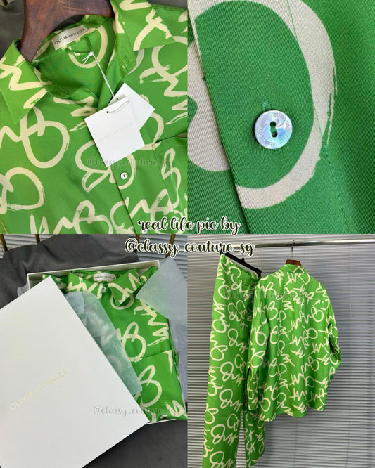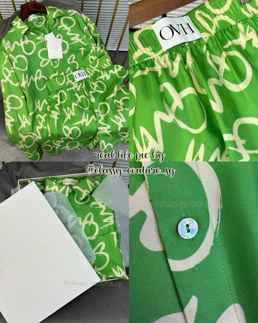 OVH Kick Print Green Signature Silk Twill Pyjamas Shirt Shorts Set