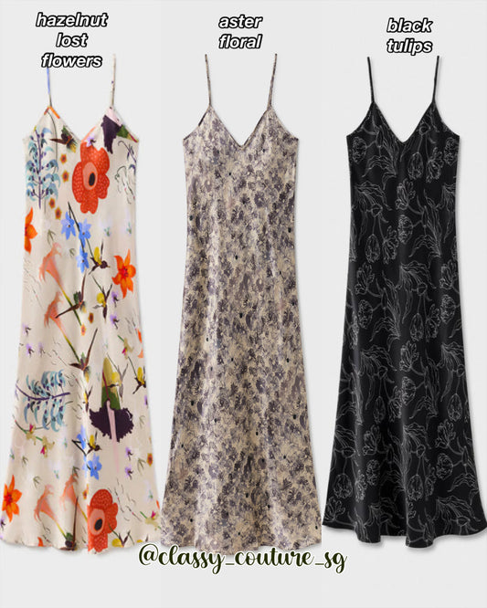 SL 90s Silk Slip Midi Dress Florals: Hazelnut Lost Flower | Aster | Black Tulips