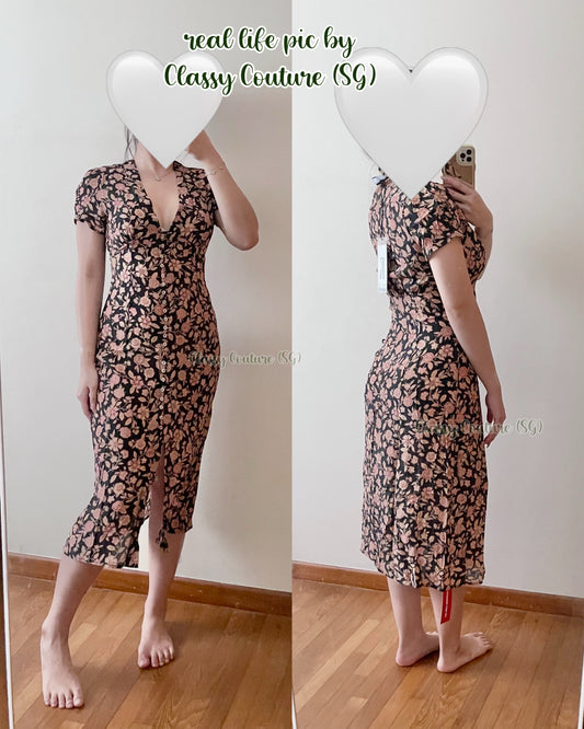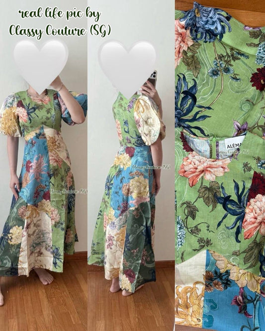 ALM Avery Puff Sleeve Linen Spliced Midi Dress
