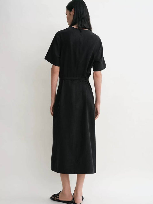 Tot Fluid Short Sleeved Tie Waist Shirtdress Lyocell-Linen Midi Dress