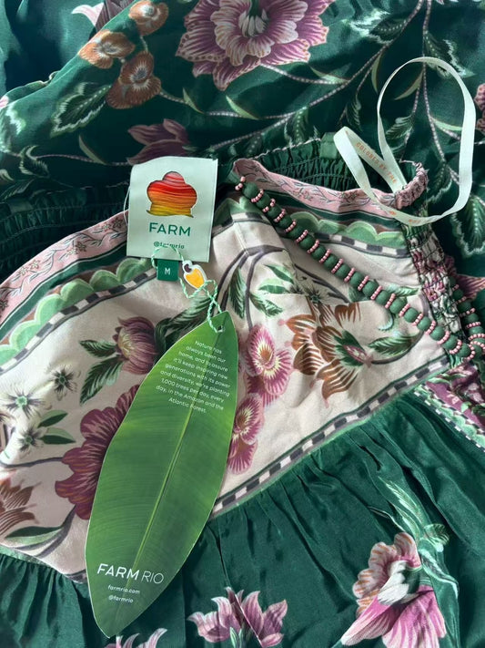 FR Green Floral Cascade Blue Yard Linen-Viscose Midi Dress
