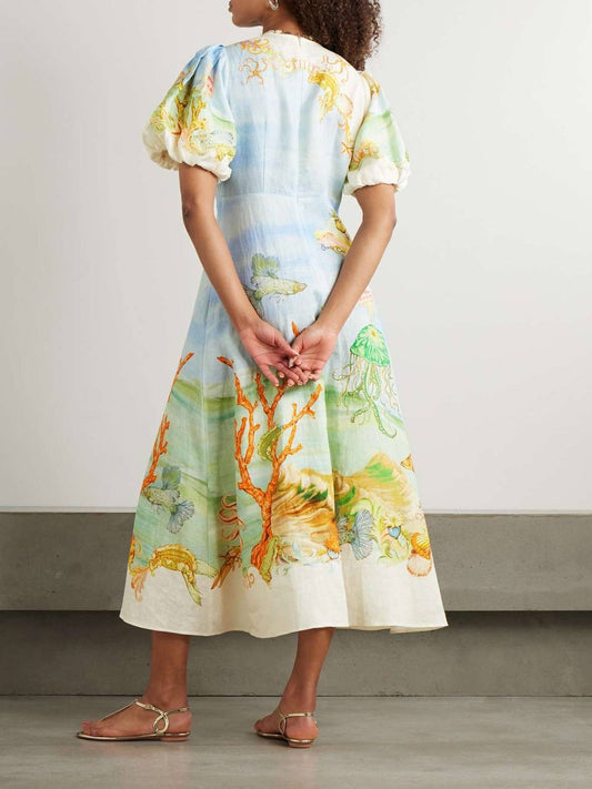 ALM Emerald Cove Printed Puff Sleeve Linen Midi Dress
