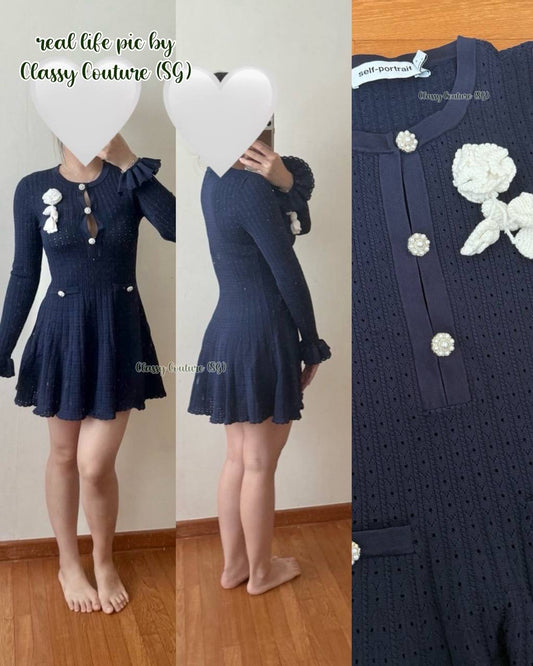 SP Navy Pointelle Knit Crochet Flower Mini Dress