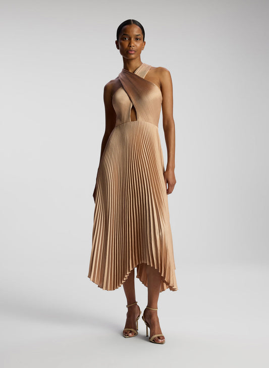 ALC Athena II Satin Pleated Halter Midi Dress in Bella Bronze Pink