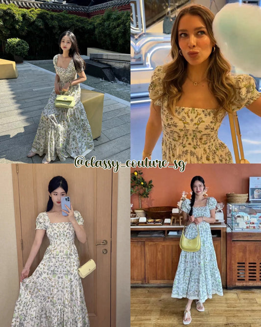 TB Printed Cotton Smocked Midi Dress in Beige Meadow