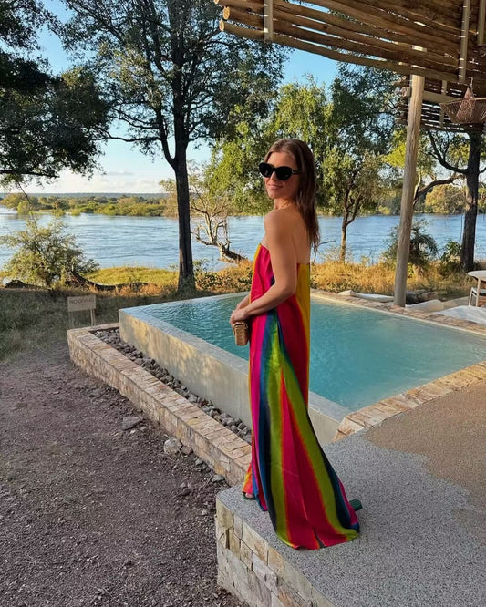 CE Aura Silk Strapless Maxi Dress in multi stripes