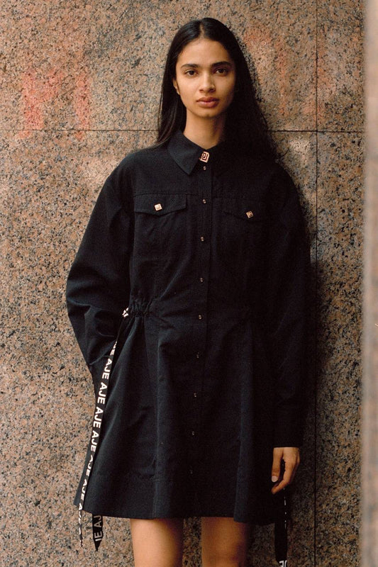 AJ Eternal Logo Mini Dress in Black and Desert Khaki Linen-Rayon
