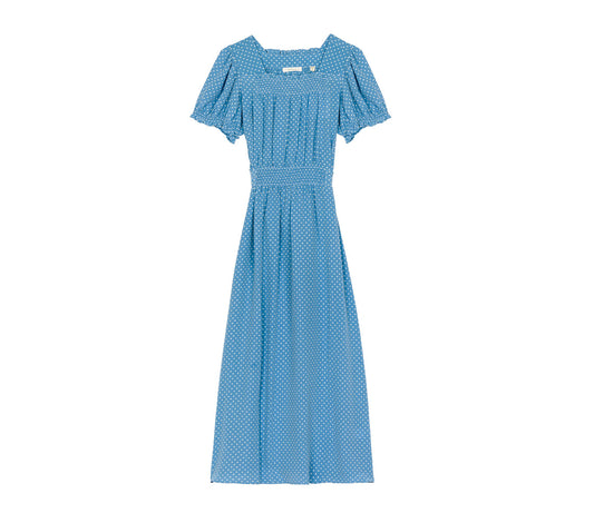 DN Castalia Silk Midi Dress in Marina Dot | blue polka dots