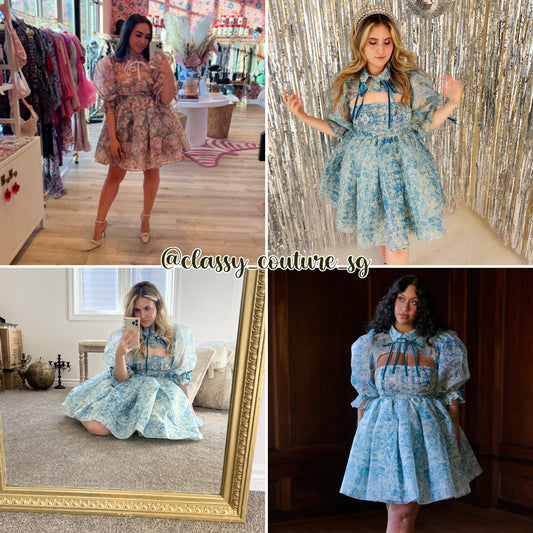 Sk Shrug Puff Mini Dress | Porcelain blue and Jardin De Fleurs pink/brown
