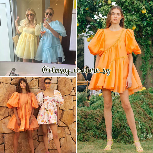 AJ Riviera Asymmetric Braided Puff Sleeve Smock Dress | mini | Mandarin Orange | Ice Blue