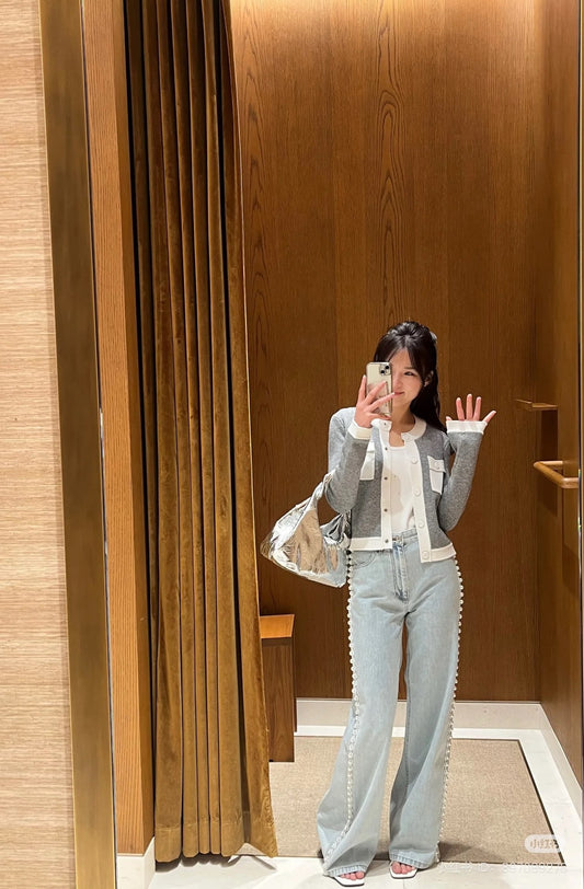SD Two-Tone Cardigan in Grey/White Wool-Cashmere