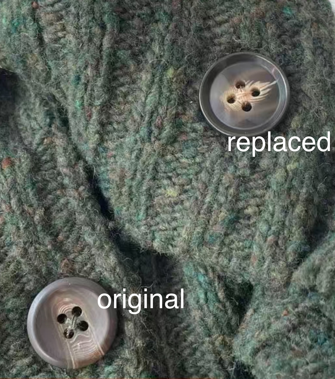 Buttons REPLACED (see 2nd image), this is not easily distinguishable from the original! As usual all original fabric, labels, etc.