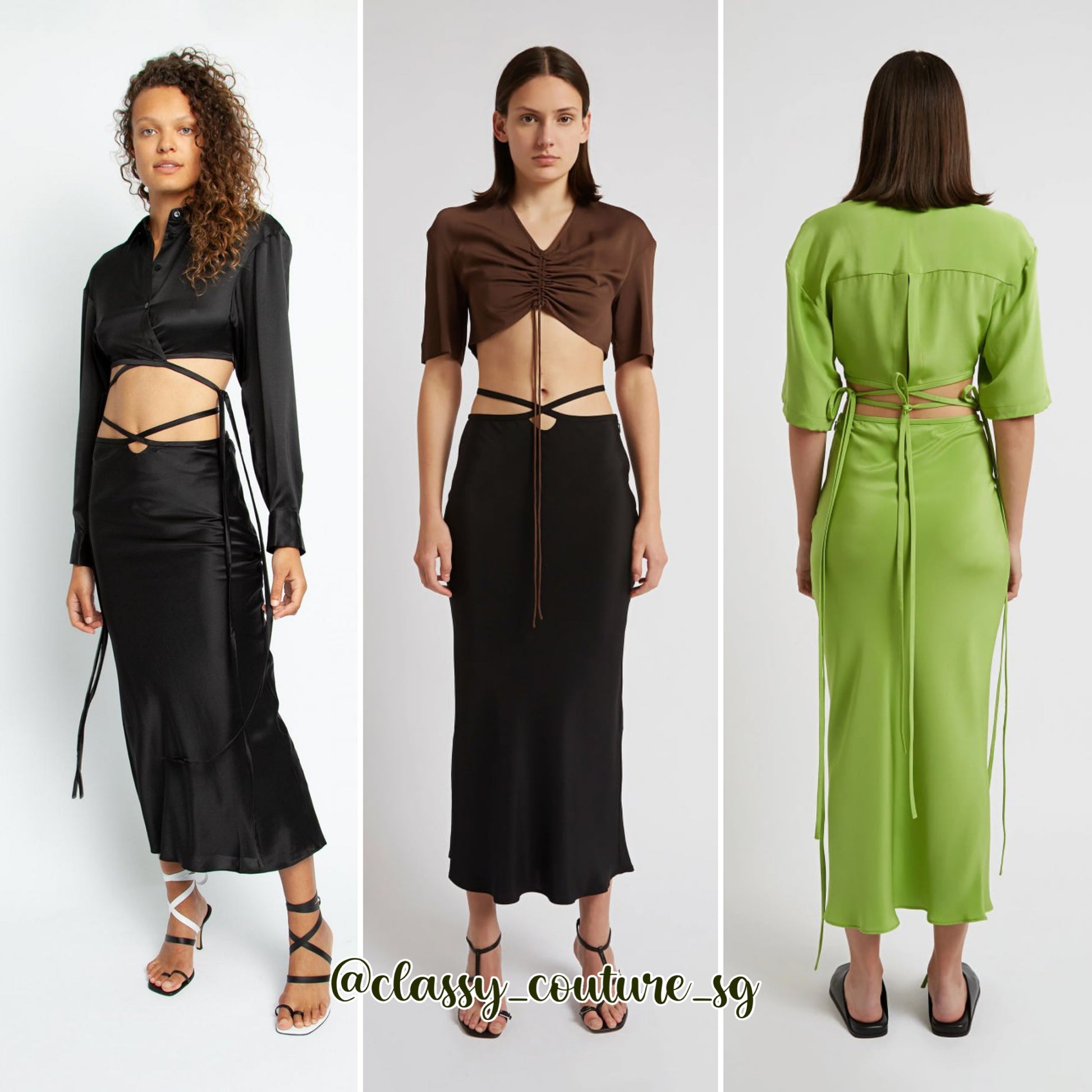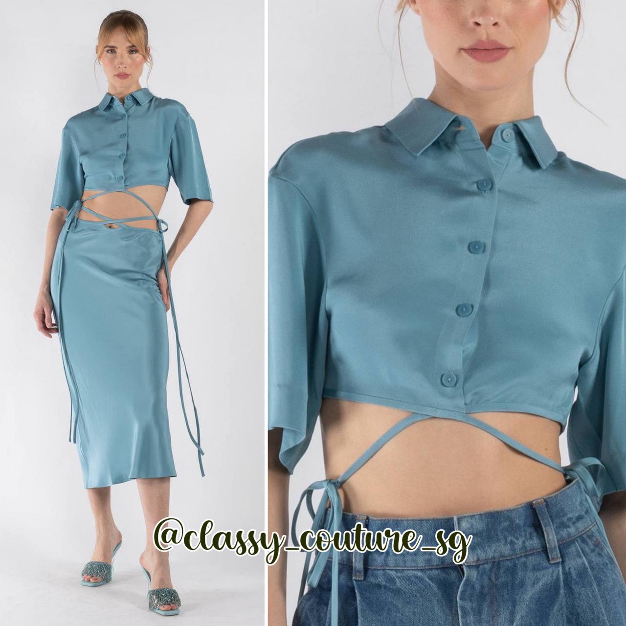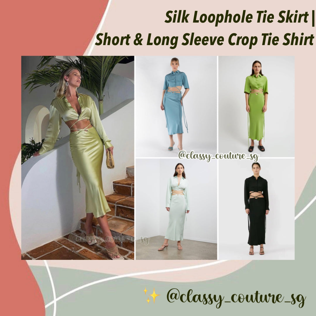 CE Silk Loophole Tie Skirt midi | Short & Long Sleeve Crop Tie Shirt | Set